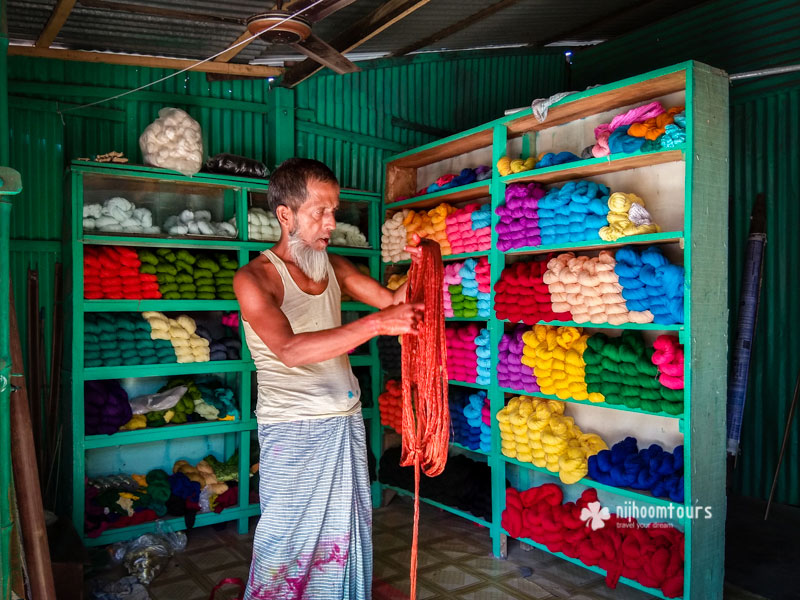 - 09.30 – 11.15 AM: Visit a Jamdani cottage and experience the Jamdani hand-weaving process. Interact with the master weavers and learn about the process of making Jamdani. Visit different shops selling the threads for making Jamdani. Also experience the process of dying the threads if available on the day.